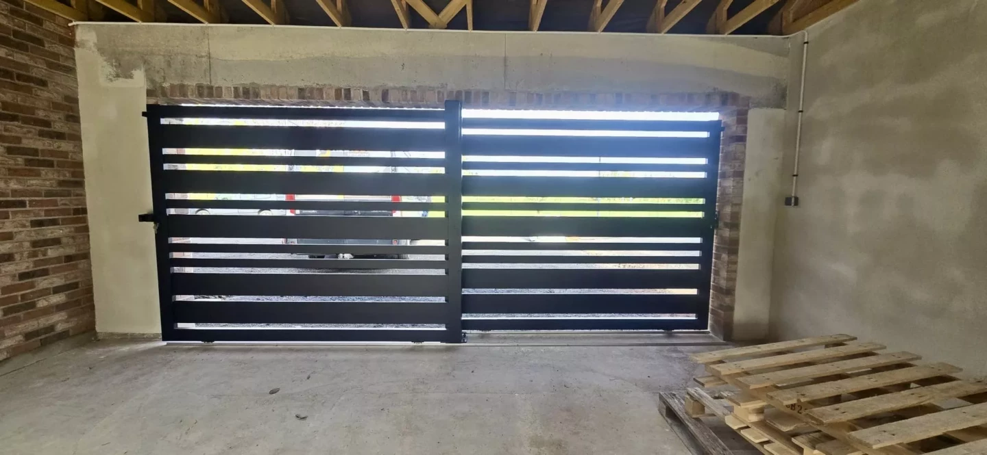 À Herrin, nos clients ont choisi une solution à la fois esthétique et ingénieuse pour fermer leur garage : deux portails coulissants qui glissent l’un derrière l’autre.